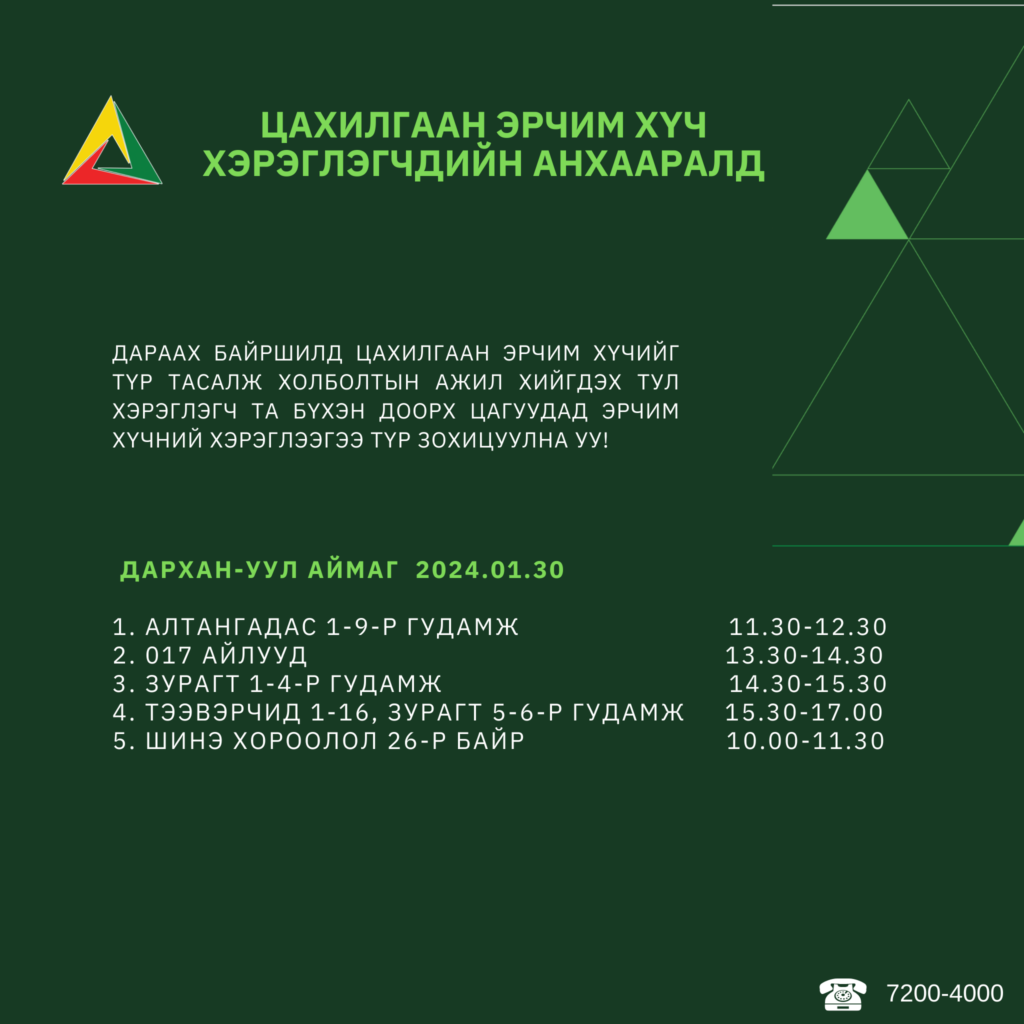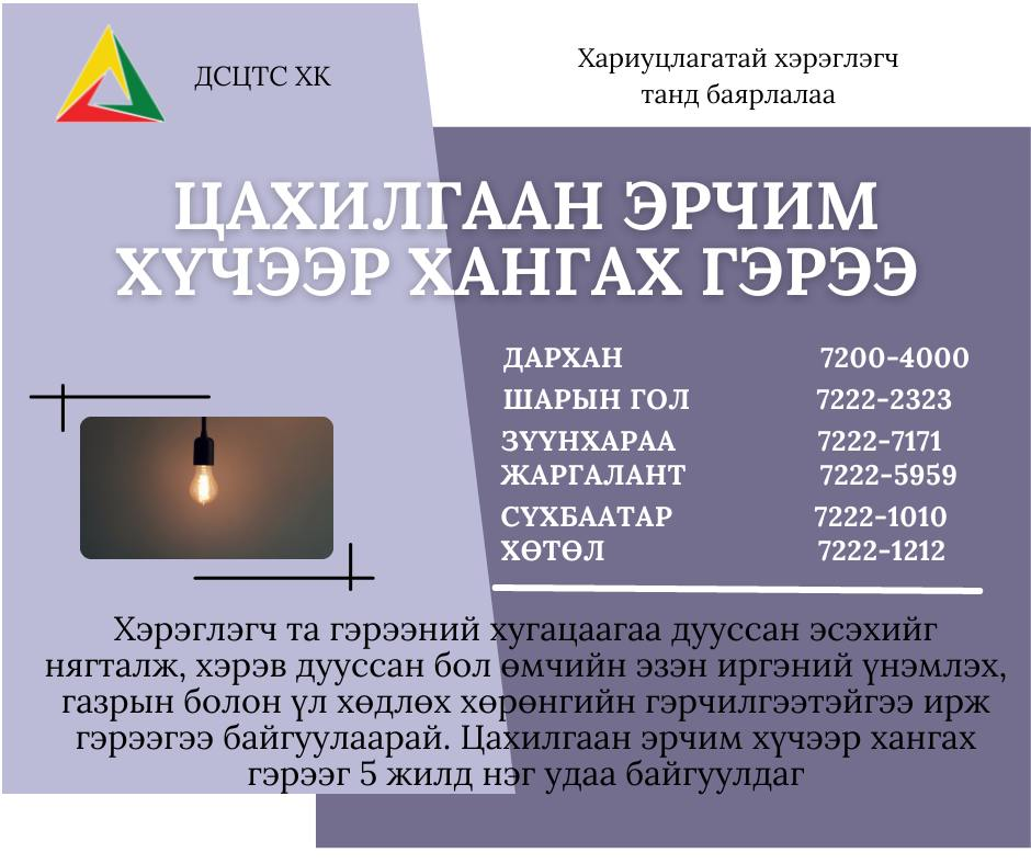 Эрчим хүч хэрэглэх дүрмийн 4.1 Хангагч нь иргэн, хуулийн этгээдтэй Эрчим хүчний тухай хуулийн 28 дугаар зүйлд заасны дагуу цахилгаан эрчим хүчээр хангах гэрээ байгуулснаар иргэн, хуулийн этгээд нь цахилгаан эрчим хүч хэрэглэх эрхээр хангагдана . Тиймээс иргэн хэрэглэгч та бүхэн эрчим хүчээр хангагдах гэрээнийхээ хугацааг дууссан эсэхийг шалгаж дууссан тохиолдолд биеэр ирж гэрээгээ хийхийг уриалж байна.